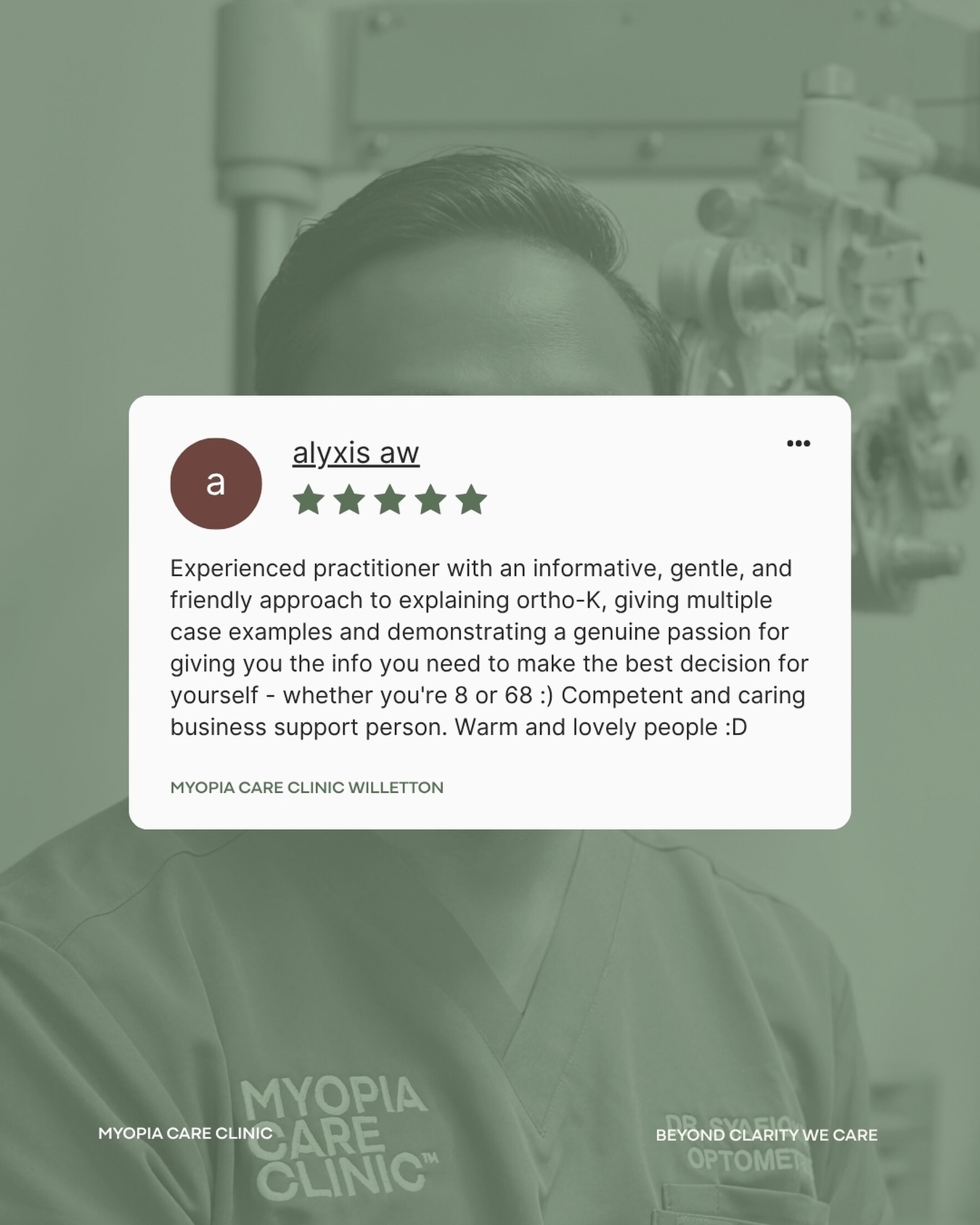 “Experienced practitioner with an informative, gentle, and friendly approach to explaining Ortho-K, giving multiple case examples and demonstrating a genuine passion for giving you the info you need to make the best decision for yourself — whether you're 8 or 68. Competent and caring business support person. Warm and lovely people.”